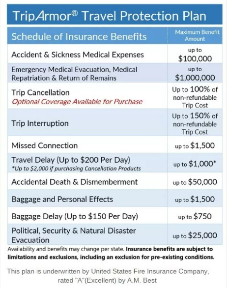 *Trip Armor Plan : $33 per person NO AGE BANDS for Post Depature benefits